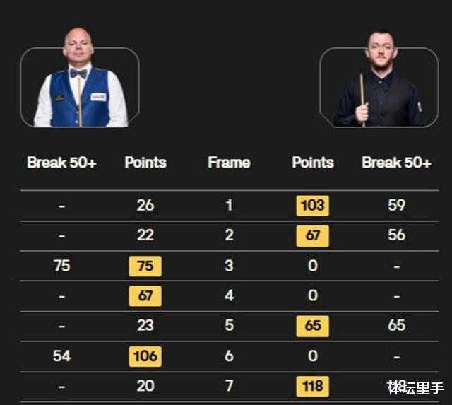 宾汉姆和马克艾伦的比赛,宾汉姆打出两杆50+,马克艾伦打出三杆50+况且在决胜局轰出单杆破百118分制胜!