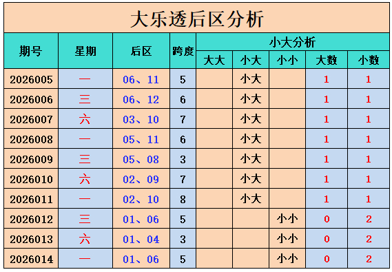 最近10期后区大小比为7:13,最近10期后区大大组合开出0期,小大组合开出7期,小小组合开出3期。上期开出小小组合,本期看好小大组合出现。